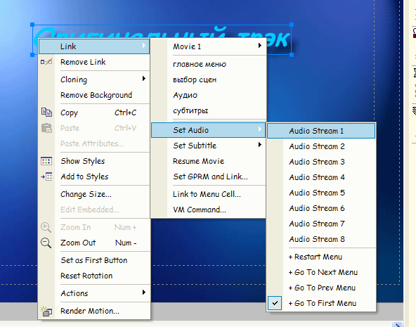 Теперь перейдите в создание меню Audio, создайте фон и две ссылки на аудиодорожки, а именно Оригинальный трек и Другой Трек. Ссылки создаются как всегда простым нажатием правой кнопки мыши, но уже не на меню или главы, а на номер звуковой дорожки. Причем помимо номера звуковой дорожки (audio stream 1, 2, 3, …) ниже выбирается второе действие, которое будет совершено после нажатия на определенную ссылку. В вашем случае это возврат в главное меню (+Go to first menu).