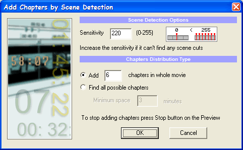 В этом окне можно выставить чувствительность к изменению сцен - Scene Detection Options. Чем больше значение в пункте Sensitivity (Чувствительность) тем больше глав вы получите. В поле Chapters Distribution Type (Тип Распределения Глав) есть два варианта. Выбрав Add X Chapters in whole movie, вы укажете количество глав, на которые будет разбит фильм, а выбор опции Find all possible chapters предусматривает указание минимальной длины одной главы в минутах. Таким образом, если в данном поле указать продолжительность главы в одну минуту и выставить максимальную чувствительность к изменению сцен (255), то количество глав будет равняться длине фильма в минутах.