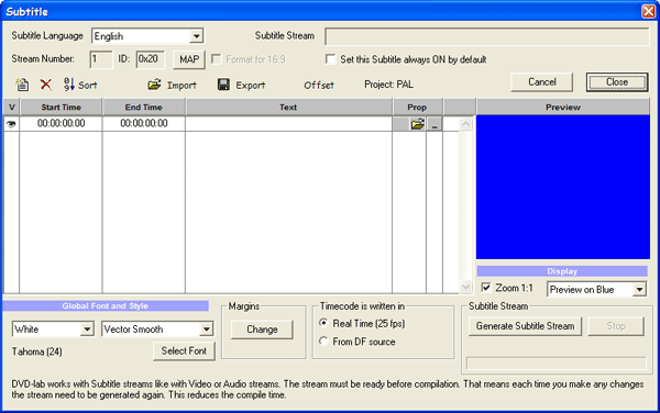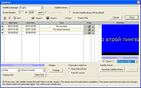 В окне превью существует возможность просматривать субтитры в том виде, как они будут выглядеть на экране, для чего и существует флажок Zoom 1:1. В нижней части этого окна в панели Global Font And Style можно изменить цвет текста, его размер, а также выбрать нужный шрифт. После того, как субтитры созданы, вы, как и в окне Motion menu, должны сгенерировать поток субтитров, для этого нажмите кнопку Generate Subtitle Stream. Программа попросит указать файл, в который она должна сохранить поток субтитров. В итоге в окне Видео вы увидите дорожку субтитров, которую впоследствии можно открыть и внести изменения.