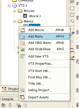 Теперь создайте еще три пустых меню, в которых у нас будут располагаться меню глав, и настройки звуков и субтитров. Нажмите в окне проекта на правую кнопку мыши и выберите пункт Add Menu, или же воспользуйтесь горячими клавишами Alt+N.