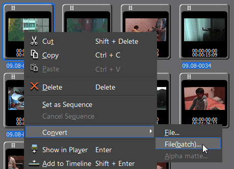 К счастью, разработчик предусмотрел подобные проблемы, включив функцию быстрой конвертации файлов непосредственно из копилки проекта. Нажатие правой кнопкой мыши на любом видеофайле либо группе выделенных файлов приведет к появлению выпадающего меню. Здесь следует выбрать пункт Convert->File либо Convert->File(batch) (если выделен один файл или несколько файлов соответственно).