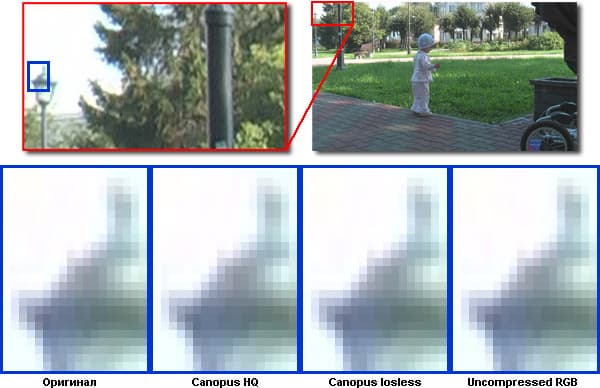 Как видим, самым подходящим вариантом (если судить по размеру получившихся файлов) является формат Canopus HQ Online (Offline) Quality. Все остальные либо изменяют размер картинки (SD downconvert), снижая его до 720х576, либо рассчитаны на безразмерные файлохранилища. Сравним качество получившихся видеофайлов, взяв из каждого по кадру и увеличив его часть (уличный фонарь на заднем плане подходит для этого как нельзя лучше).