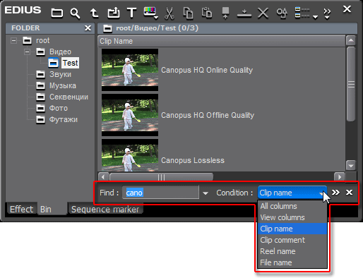 Удобно теперь организован поиск содержимого в копилке проекта (вкладка Bin). Нажатие клавиши F3 приводит к появлению поисковой строки, где пользователь имеет возможность набрать нужное буквосочетание, при этом в окне отобразятся файлы, имеющие в своем названии искомое. Способ поиска выбирается тут же, в выпадающем меню по имени клипа, комментарию, имени файла...