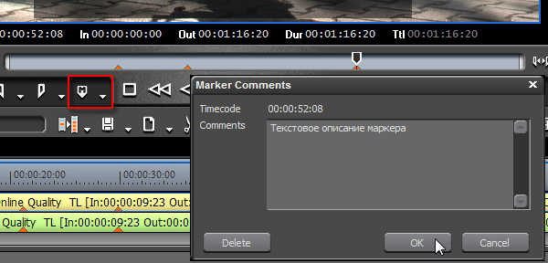 Маркеры, расставленные на клипах, захваченных в Canopus HQ, будут сохраняться в них и далее, не только в данном проекте. Но какой маркер без текстового обозначения? Разработчики об этом тоже подумали, и предусмотрели ввод текстового обозначения с ограничением объема в 1024 знака.