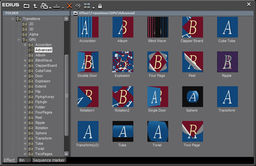 Поражает количество переходов, просчет которых может ускоряться за счет графического процессора видеокарты GPU Accelerated Video Transitions. Всего их 1389 (это не опечатка, их действительно одна тысяча триста восемьдесят девять), объединенных в 22 группы с подгруппами в каждой. Само собой, большинство заготовок представляют собой один и тот же по сути переход, однако настройки их всегда разные. Сделано это, по всей видимости, для удобства пользователя, который может выбрать из существующего списка несколько нужных только ему заготовок и поместить в собственноручно созданную папку для быстрого к ним доступа.