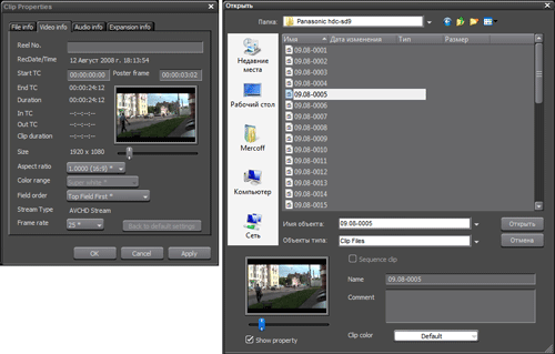 Импорт материала в проект осуществляется двойным щелчком по панели Bin, при этом откроется стандартное диалоговое окно выбора файлов. Окно-то стандартное, да не совсем. Если отметить флажком пункт Show Property, то рядом с диалоговым отобразится еще одно окно: Clip Properties. Здесь пользователь видит самую исчерпывающую информацию об импортируемом клипе; более полного отчета обо всех свойствах медиафайла трудно даже представить. Исключительно удобный инструмент, честь и хвала разработчику!