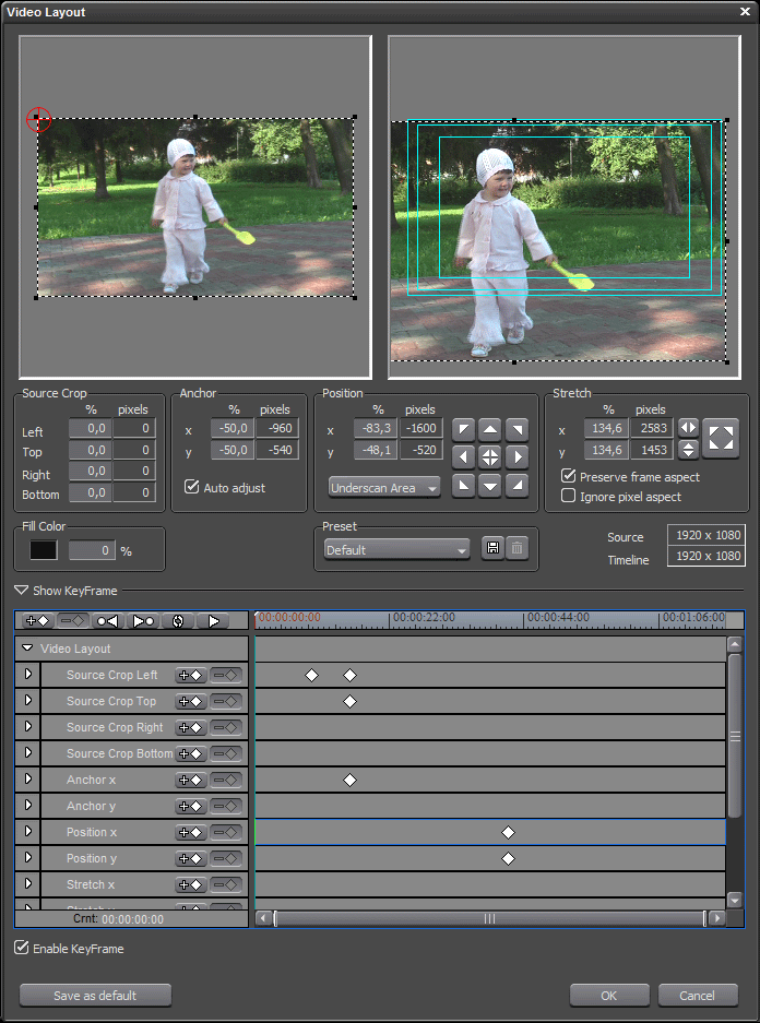 Рассмотрим модуль панорамиования Video Layot, вызываемый клавишей F7. В левом окне оригинальный кадр, в правом отображаются текущие изменения размера или положения картинки. Этот удобный модуль, предназначенный для точного позиционирования видокадра или фотографии содержит множество инструментов трансформации кадра и заливки, причем каждый инструмент настраивается по ключевым точкам.