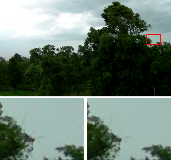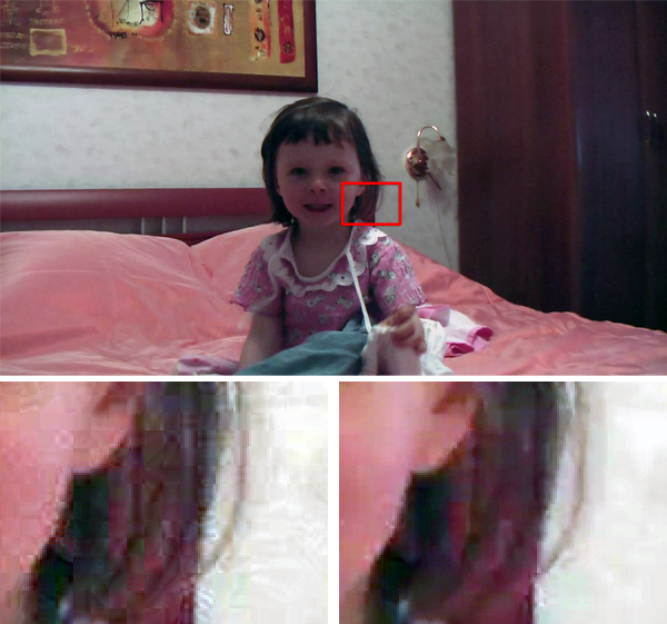 Слева - "кропнутый" кадр из неочищенного видео. Справа - из обработанного "шумодавом". Оба рисунка сжаты в Photoshop с качеством JPG = 80%.