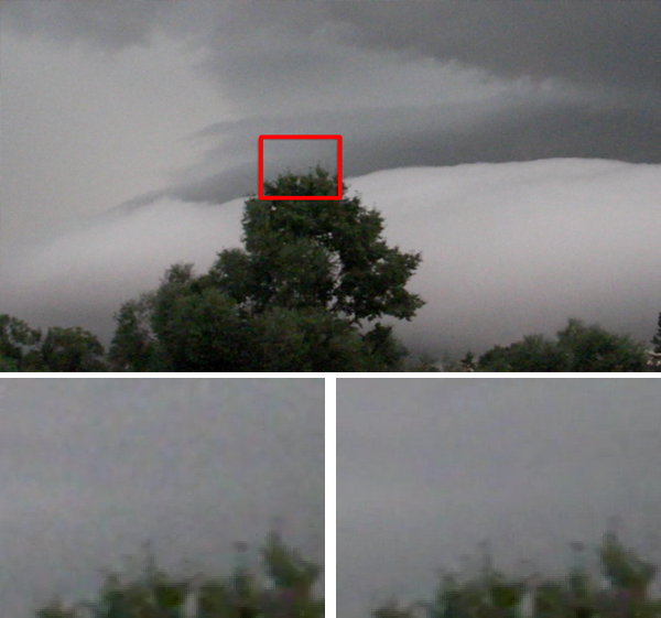 Ниже приведен еще один пример пасмурного неба - эти кадры сняты на любительскую видеофотокамеру Sanyo Xacti VPC-HD700. Цветная рябь здесь, кажется, заполонила всё небо.