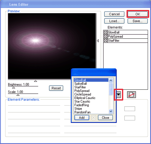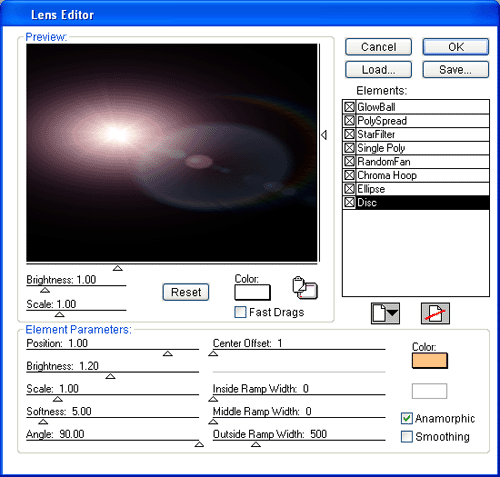 Загрузится окно настроек: Lens Editor. Здесь вы можете убирать, добавлять различные элементы, а также изменять их параметры.