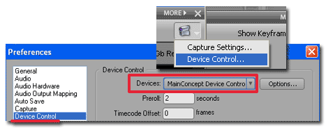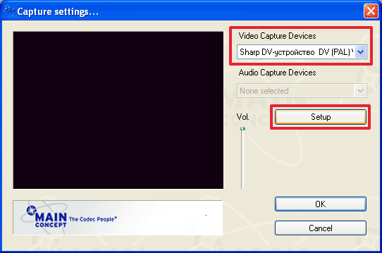 Вызовите клавишей F5 окно захвата, и выберите пункт Device Control из выпадающего списка, появляющегося при нажатии на пиктограмму видеокамеры. В разделе Device Control выберите MainConcept Device Control и нажмите OK.