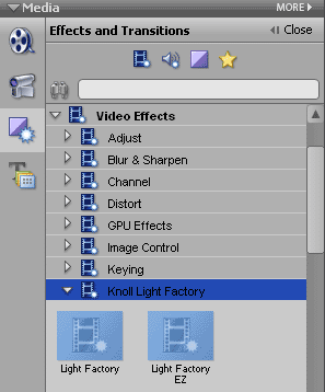 Для применения данного эффекта к видео, необходимо найти его в разделе Effects and Transition (Video Effects > Knoll Light Factory) и перетянуть иконку эффекта на клип, расположенный на таймлинии.