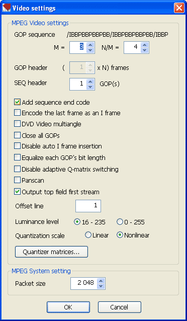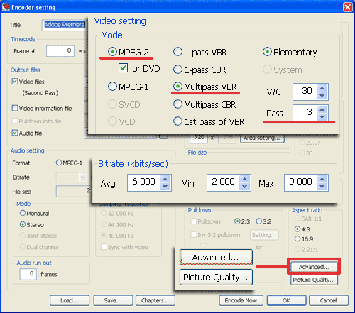 В разделе Video Settings выберите формат MPEG-2 (отметив флажком пункт for DVD), и, в целях получения наилучшего качества видео, многопроходный переменный режим: Multipass VBR. Количество проходов просчета выставляется в пункте Pass. Если вы хотите изменить значения битрейта, то это можно сделать в разделе Bitrate. Для доступа к расширенным настройкам кодера нажмите кнопку Advanced. Загрузится окно Video settings: