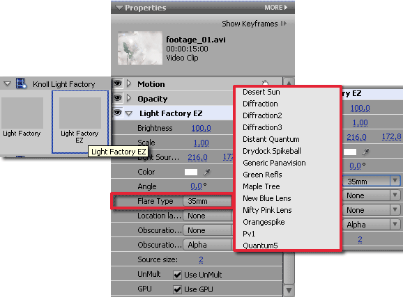 Примените к клипу, находящемуся на таймлинии, второй эффект: Light Factory EZ. Теперь откройте закладку Light Factory EZ. Далее — в пункте Flare Type, вы можете видеть большой список шаблонов. Все параметры вспышек также анимируются, что обеспечивает достоверность и реалистичность эффекта.