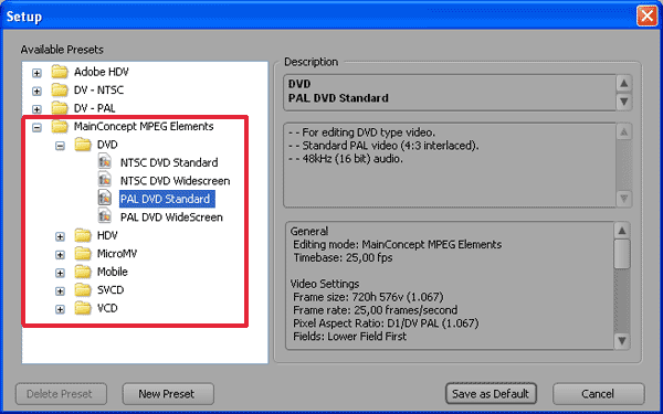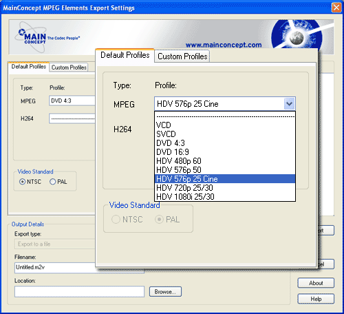 Для экспорта видео, например, для дальнейшего авторинга, выполните команду File > Export > MainConcept Mpeg Elements. Обратите внимание на количество доступных профилей для формата Mpeg.