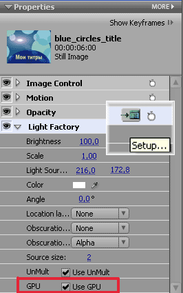 Теперь окно свойств клипа содержит пункт Light Factory. Обратите внимание на флажок, установленный перед пунктом Use GPU; его наличие говорит о том, что при построении предварительного просмотра будет задействован GPU видеокарты. При снятом флажке просчет предварительного просмотра будет производиться только центральным процессором компьютера, что может помешать тщательной оценке действий эффекта. Для доступа к дополнительным настройкам нажмите кнопку Setup.