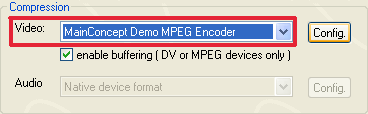 В разделе Compression окна Setup выберите компрессор MainConcept Demo MPEG Encoder, и нажмите кнопку Config.