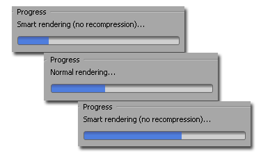 Теперь при экспорте будет происходить следующее: во время обработки тех мест, где не применялись эффекты, отображается надпись Smart rendering (no recompression), но, как только просчет дойдет до места, где присутствует переход или эффект, идет полный пересчет: Normal rendering.