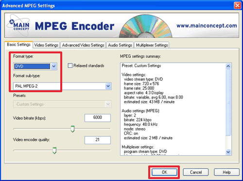 Оставьте настройки по умолчанию Format type: DVD, Format sub-type: PAL MPEG-2, и нажимаете кнопку OK.