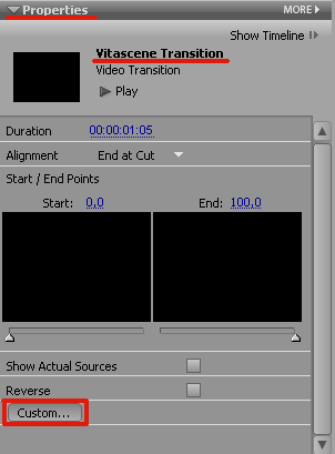 Vitascene содержит и множество интереснейших и эффектных переходов, находящихся в папке Media > Video Transitions > proDAD > Vitascene Transitions. Переход, устанавливаемый по умолчанию, не представляет особого интереса, и, чтобы изменить его, необходимо нажать кнопку Custom — в этом случае запустится окно параметров перехода.