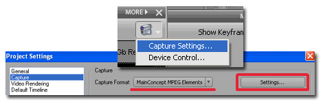 Но программа еще не готова к захвату посредством MainConcept MPEG Elements. Осталось совсем немного: нажмите снова ту же пиктограмму видеокамеры, но на этот раз выберите пункт Capture Settings. Здесь, в разделе Capture, выберите MainConcept MPEG Elements, а для доступа к дополнительным настройкам нажмите кнопку Settings...