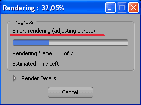 Появится окно Rendering и надпись над строкой статуса Smart rendering (adjusting bitrate)... Она говорит о том, что идет пересчет только изменяемых частей клипа и в скобках настройка битрейта.