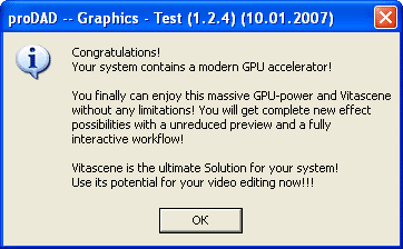 В конце прошлого года компания proDAD порадовала своих поклонников выпуском нового плагина (а точнее — мощного инструмента, включающего в себя целую массу различных эффектов и переходов) — Vitascene 1.0 (демоверсии плагинов этой компании можно скачать. Набор эффектов proDAD Vitascene 1.0, в отличие от большинства других плагинов, активно задействует ресурсы GPU видеокарты при просчете эффектов, что значительно ускоряет работу. Однако в связи с этим и требования к видеокарте достаточно высоки, почти как к современным 3D-играм: поддержка DirectX 9 и Shader 2.0. Более того, рекомендованный объем видеопамяти — 256 мегабайт! Проверить «на состоятельность» вашу графическую подсистему можно с помощью специальной утилиты: prodad-check3d3.exe. Если ваша видеокарта соответствует запросам плагина, появится такое поздравительное окошко: