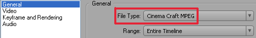 Чтобы экспортировать ваш проект в MPEG посредством Cinema Craft Encoder SP2, выделите таймлинию и выполните команду File > Export > Movie (Ctrl+M). Здесь, в диалоге Export Movie, нажмите кнопку Settings, и, перейдя в закладку General, выберите тип файла Cinema Craft MPEG.