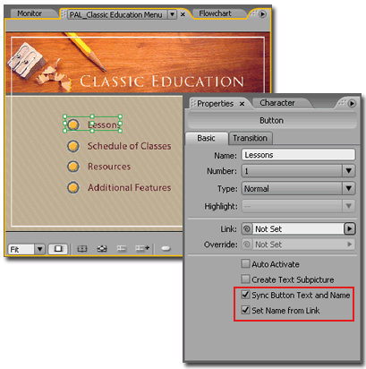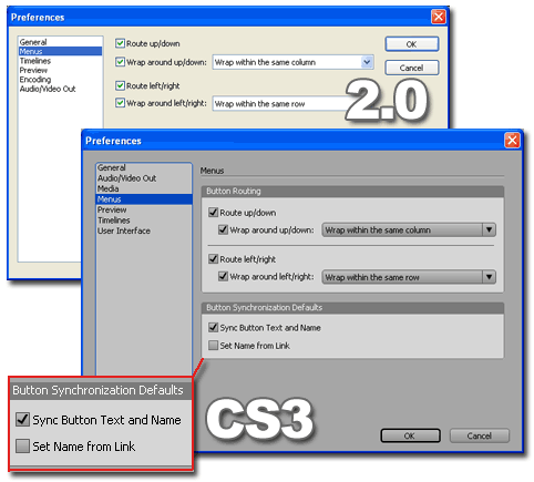 Sync Button Text and Name эта опция изменила свои свойства, ранее в Encore DVD 2.0 она синхронизировала как название кнопки в свойствах, так и название кнопки в меню. Теперь же она отвечает только за синхронизацию имени маркера главы таймлинии с названием кнопки в меню. А за синхронизацию названия кнопки отвечает новая опция Name from Link. Ценность добавления данных опций в окно настроек Preferences в том, что задать нужный алгоритм действий можно один раз, а не снимать флажок для каждой кнопки в каждом меню, как это было в Encore DVD 2.0. Таким образом, сохраняются как время, так и нервы. Рассмотрим это на конкретном примере: