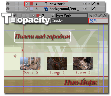 Переместите текстовый слой так, чтобы он находился перед фоновым слоем, и уменьшите параметр прозрачности до 70%.