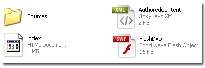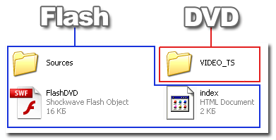 Например, если у кого-то нет DVD плеера на ПК, то диск можно просмотреть с помощью браузера. Таким образом можно добавлять бонусные материалы к DVD диску, просмотреть которые можно только на компьютере. Структура такого диска представлена ниже