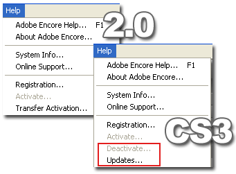 В разделе Help удалена команда Transfer Activation, и добавлены команды Deactivate и Updates. Команда Deactivate предназначена для деактивации компонентов Adobe Encore CS3 (без повторной активации невозможно будет запустить Adobe Encore CS3 на данном компьютере). Введение этой команды, скорее всего, связано с проблемой, возникавшей при деинсталляции продукта и повторной его установкой, возникавшей у ряда пользователей программных продуктов линейки CS2.