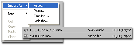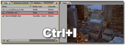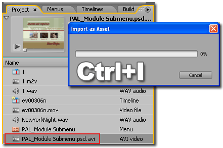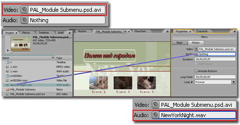 Если вы хотите добавить перед появлением меню видеозаставку, то в первую очередь следует импортировать видео, которое будет служить этой заставкой (Ctrl+I). Аудио файл для заставки можно взять из библиотеки Scores программы Adobe Soundbooth CS3.