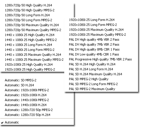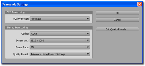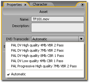 Быстрый доступ к шаблонам Quality Presets вы можете получить в палитре Properties. В пункте DVD Transcode вызывается хорошо знакомый список с шаблонами, но обратите внимание в Adobe Encore CS3 отсутствует пункт Don't Transcode.
