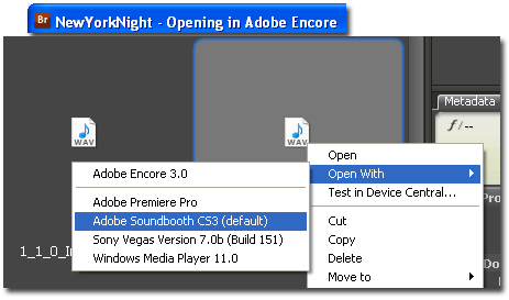 Запустится программа Adobe Bridge CS3 и откроет папку с библиотекой Scores NewYorkNight, откуда вы импортировали файл. Теперь нажмите правую кнопку мыши на файле и выберите Open With > Adobe Soundbooth CS3.