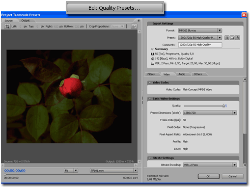 Для изменения настроек шаблона нужно нажать кнопку Edit Quality Presets (или выполнить команду File > Edit Quality Presets), после чего загрузится окно Project Transcode Presets.