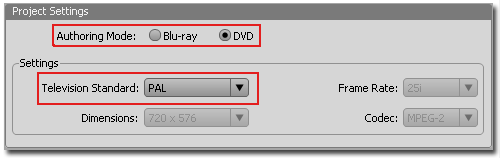 Далее выбираем режим авторинга и ТВ стандарт. В случае выбора режима DVD будет доступен выпадающий список лишь с двумя пунктами: PAL и NTSC. Выбираем, разумеется, PAL.