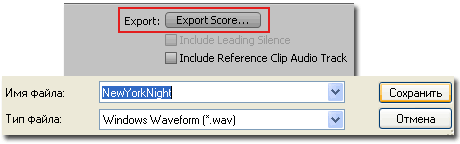Для экспорта созданной композиции нажмите кнопку Export Score, выберите нужную директорию на жестком диске и нажмите кнопку Сохранить.