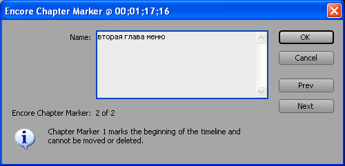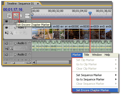 Для того, чтобы во время редактирования видео в Premiere Pro установить маркер главы в том месте, где находится индикатор текущего времени, нажмите кнопку Set Encore Chapter Marker, или выполните команду Marker > Set Encore Chapter Marker.