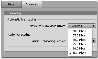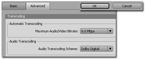 Для выбора битрейта видео и формата аудио переключимся на закладку Advanced, и установим максимальный битрейт для автоматического транскодирования файлов. Здесь же выберем Dolby Digital для звука.