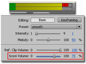 Если при проигрывании на индикаторе уровня звука появляются зоны красного цвета, это означает, что уровень звука в некоторых местах неприемлем для нормального последующего воспроизведения. Чтобы в дальнейшем избежать щелчков звука на транскодированном материале, уменьшите значение параметра Score Volume.