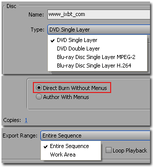 Здесь вы можете выбрать тип диска: однослойный, двухслойный, Blu-ray MPEG-2/H.264, а также выбрать метод записи диска - с меню или без такового. Здесь же определяется экспортируемая область: вся последовательность или только материал, ограниченный рабочей областью.