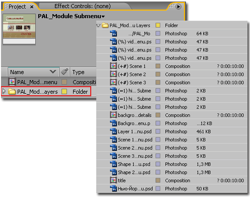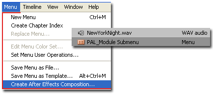 Чтобы анимировать меню, можно использовать программу Adobe After Effects CS3, также входящую в пакет CS3. Выделите меню в списке палитры Project и выполните команду Menu > Create After Effects Composition.