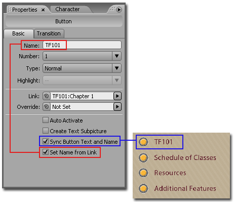 При флажках, установленных перед опциями Sync Button Text and Name Set и Name from Link, свяжем кнопку с таймлинией, и взглянем на результат: