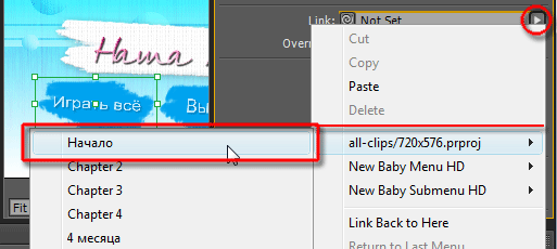 В выпадающем диалоге данной строки перечислен весь импортированный в проект материал, включая и созданные во время работы объекты. Всё, что теперь требуется, — это быть внимательным при выборе нужной ссылки. Поскольку первая наша надпись — "Играть всё" — должна вести к самому началу фильма, то и ссылку поставим соответствующую: