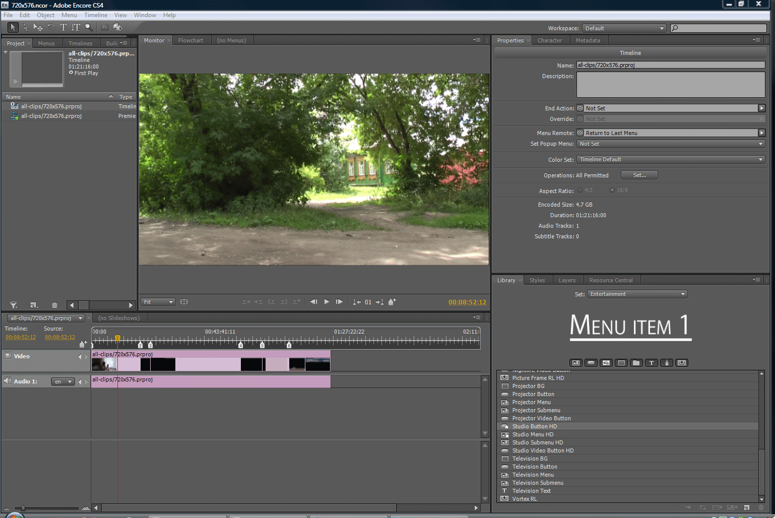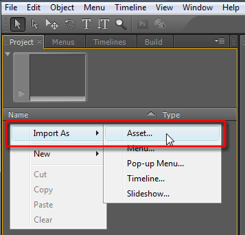 Мы создали проект, импортировав его из Adobe Premiere Pro. Но неужели это единственный способ? Конечно, нет! DVD-видео диск здесь можно создать, импортировав какой угодно материал. Чтобы пополнить копилку проекта новыми файлами, достаточно дважды щелкнуть мышью в пустой области вкладки Project, либо, нажав здесь правой кнопкой мыши, выбрать команду Import as -> Asset...
