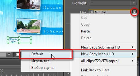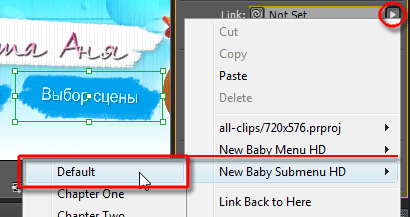 Теперь задачка сложнее — вторая ссылка ("Выбор сцены") должна вести на второе меню — Submenu. Активируем надпись, и тем же образом выберем строку New Baby Submenu HD -> Default.
