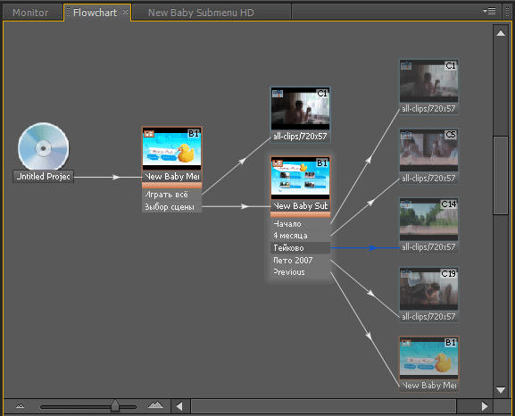 Flowchart это не новинка, данный инструмент присутствовал и в ранних версиях Adobe Encore. Однако, в отличие от прежних версий, теперь масштаб отображения "конструктора" можно изменить специальным ползунком ещё одно эргономическое усовершенствование.