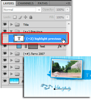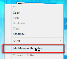 Опять неприятность: при наведении курсора (активации) на кнопку с детскими пяточками вдруг появляется слово Previuos. Конечно, мы не могли его раньше видеть, а точнее — просто не обратили внимания. Как же его изменить, если оно не отображается на экране редактирования меню? К сожалению, без редактирования графики нам тут не обойтись. Данное слово — "Previous" — является ничем иным, как графическим элементом, расположенным в одном из слоёв psd-документа. И чтобы это слово изменить, придется поработать в графическом редакторе, поддерживающем работу с многослойным форматом PSD. Нажмите правой кнопкой мыши в окне редактирования меню, и выберите команду Edit Menu in Photoshop.