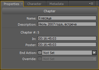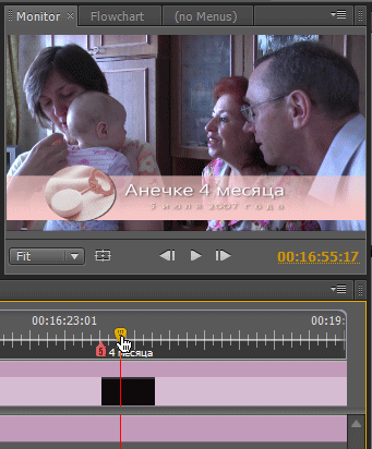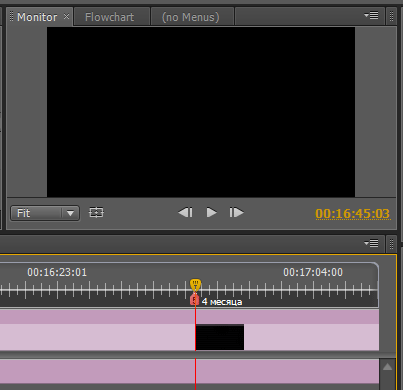 Почему? Сейчас всё станет понятно. Как видно на рисунке, если переместить ползунок таймлинии точно в метку главы №5 с названием "4 месяца", вместо видео мы наблюдаем черный экран. Разумеется, ведь во время монтажа использовались переходы между сценами. В данном случае таким переходом является Deep to Black, представляющий собой затемнение стыкуемых кадров с уходом в чёрное.
